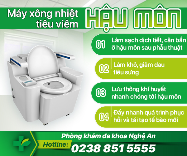 Các trang thiết bị, máy móc được nhập khẩu từ nước ngoài, có nguồn gốc rõ ràng hỗ trợ đắc lực cho các y, bác sĩ trong việc khám và hỗ trợ chữa bệnh. Nhờ đó, các bác sĩ có thể vận dụng các phương pháp hỗ trợ khám chữa tiên tiến đó là loại bỏ vùng viêm hậu môn. Sử dụng Máy xông nhiệt tiêu viêm hậu môn để tăng hiệu quả điều trị, giảm đau và tái tạo cũng như nhanh lành vết thương hơn.