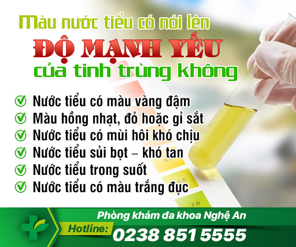 Màu nước tiểu có nói lên độ mạnh yếu của tinh trùng không là thắc mắc của nhiều nam giới. Các chuyên gia tại Đa Khoa Nghệ An sẽ cung cấp những thông tin liên quan đến vấn đề này qua bài viết dưới đây để nam giới có thể tự mình kiểm chứng được tình trạng của cơ thể cũng như “tinh binh” của mình.