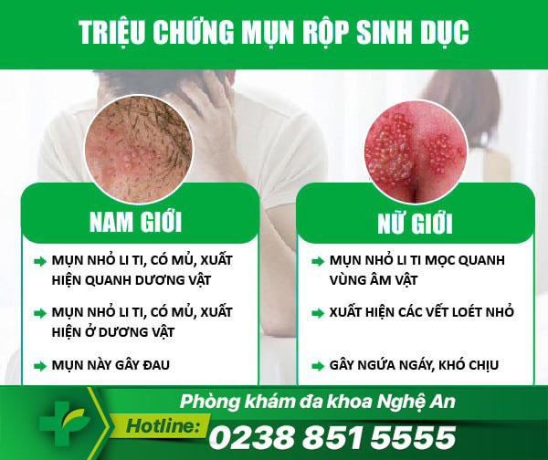 Theo các bác sĩ phòng khám Đa Khoa Nghệ An cho biết, khi mắc bệnh mụn rộp sinh dục ở cơ quan sinh dục nam và nữ sẽ có những biểu hiện như:
