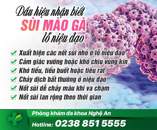 Bệnh do virus HPV (Human Papilloma Virus) gây ra các triệu chứng như: xuất hiện nốt chấm đỏ, mụn cóc, sau đó phát triển lớn có dạng mồng gà, súp lơ… ở bộ phận sinh dục nam/ nữ, tầng sinh môn, hậu môn, bìu, niệu đạo hoặc bên trong âm đạo, cổ tử cung nữ giới.